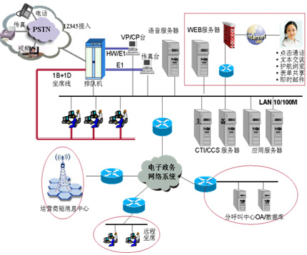 針對(duì)政府目前熱線電話眾多,管理不規(guī)范,資源無(wú)法共享的問(wèn)題,華為公司提出的基于資源整合理念的解決方案,采用華為公司呼叫中心技術(shù)構(gòu)建完整的計(jì)算機(jī)電信集成(CTI)系統(tǒng)體系,并充分利用政府現(xiàn)有的信息網(wǎng)絡(luò)資源,一方面整合原有分散的熱線,啟用12345政府熱線號(hào)碼統(tǒng)一接入;另一方面將自動(dòng)語(yǔ)音查詢、人工服務(wù)、信息資料處理緊密結(jié)合起來(lái),依托地方政府各類(lèi)業(yè)務(wù)技術(shù)支持系統(tǒng)和網(wǎng)絡(luò)系統(tǒng),建立一套通暢的來(lái)電業(yè)務(wù)公文流轉(zhuǎn)系統(tǒng),通過(guò)人工受理或自動(dòng)語(yǔ)音服務(wù)等方式,為人民群眾提供全天候24小時(shí)不間斷的服務(wù)。最終整合現(xiàn)有的全部政府部門(mén)政府熱線資源,使政府政府熱線服務(wù)范圍覆蓋到政府公共服務(wù)的全部領(lǐng)域,為市民提供全方位、全天候、高效率的政府政府熱線服務(wù),市民只記一個(gè)電話號(hào)碼,只打一次電話,就能得到政府答復(fù)和服務(wù)。