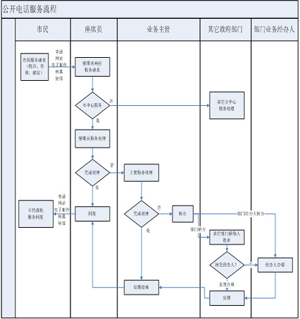 后臺(tái)處理座席員根據(jù)業(yè)務(wù)知識(shí)、資料庫(kù)和管理職責(zé)為市民服務(wù),如果不能處理,將請(qǐng)求提交相關(guān)政府部門(mén)并限時(shí)處理;
