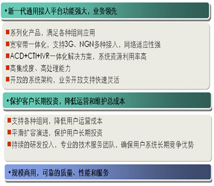根據(jù)證券行業(yè)的特點,華為提供量身定制的證券業(yè)多媒體聯(lián)絡中心一體化解決方案。作為與客戶有效溝通交互的平臺,華為多媒體聯(lián)絡中心結合了電話、傳真、Email、Web和VoIP等現(xiàn)代通信手段,是實現(xiàn)客戶服務、銷售及市場推廣等多種目的的高效溝通渠道;谟嬎銠C與通信集成(Computer