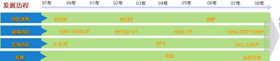 多媒體會議主要提供語音、視頻、數(shù)據(jù)的融合會議解決方案。傳統(tǒng)的多媒體會議在2001年前主要是專線(E1/ISDN)H.320的視頻會議系統(tǒng)。隨著寬帶(LAN/ADSL)的發(fā)展,2002年至2007年主要是H.323的視頻會議系統(tǒng),同時兼容H.320的專線視頻會議系統(tǒng)。2007年前音頻的主要是8k采樣的G.7xx協(xié)議,2007年后寬頻語音AAC-LD已經(jīng)普遍使用。視頻2007年前主要是4CIF格式以下的標清系統(tǒng),2007年后H264