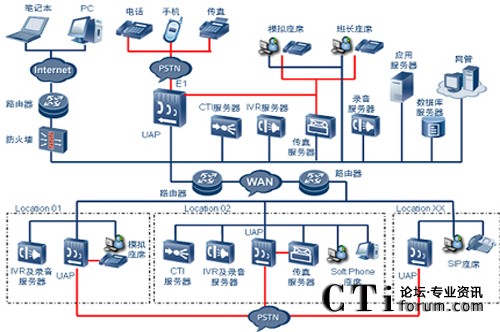 華為多媒體聯(lián)絡(luò)中心提供完善的分布式組網(wǎng)及集中式組網(wǎng)功能,可以提供分布式接入、分布式IVR、分布式錄音系統(tǒng)、分布式坐席、分布式傳真系統(tǒng)及網(wǎng)絡(luò)呼叫中心技術(shù)。如果各個(gè)分支機(jī)構(gòu)有較多本地化業(yè)務(wù)需求的時(shí)候,各個(gè)分支機(jī)構(gòu)只需要再配置一臺(tái)CTI服務(wù)器,就可以升級(jí)成完整的聯(lián)絡(luò)中心系統(tǒng),可以單獨(dú)開展豐富的個(gè)性化業(yè)務(wù)。如果總部再安裝一套網(wǎng)絡(luò)呼叫中心,則可以實(shí)現(xiàn)聯(lián)絡(luò)中心的互連,即網(wǎng)絡(luò)呼叫中心。