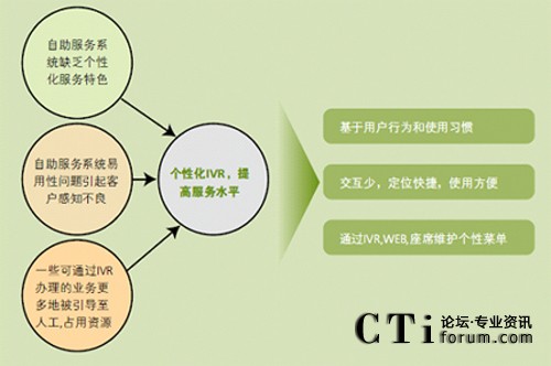 最終用戶可以提取常用業(yè)務(wù)定制自己的IVR菜單,減少語音提示和操作步驟,獲取服務(wù)更為準確快捷,提升了業(yè)務(wù)受理效率,降低了對系統(tǒng)的占用時間。自動業(yè)務(wù)流程隨著最終用戶對受理業(yè)務(wù)需求的變化,運行效率也會隨之變化,系統(tǒng)將對自動業(yè)務(wù)流程的所有節(jié)點進行跟蹤分析,根據(jù)效率最大化原則對業(yè)務(wù)節(jié)點進行排序和調(diào)整。這些細節(jié)的改進,可以最大限度地降低每次交互占用的時間,提升了客戶滿意度,降低了交互成本。