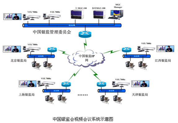 中國銀監(jiān)會目前已經(jīng)擁有一個高速、高可靠性的ATM骨干傳輸網(wǎng)絡,網(wǎng)絡采用星形結(jié)構(gòu),各分支機構(gòu)到北京總部的線路均為2條15M ATM線路,這種優(yōu)良的網(wǎng)絡非常適合視頻會議業(yè)務的運營。視頻會議網(wǎng)建立完成后可以實現(xiàn)通過遠程視頻會議,遠程處理重點銀行業(yè)金融機構(gòu)監(jiān)事會的日常管理工作;遠程審查銀行業(yè)金融機構(gòu)高級管理人員任職資格;遠程討論協(xié)商制定有關銀行業(yè)金融機構(gòu)監(jiān)管的規(guī)章制度和辦法;遠程對銀行業(yè)金融機構(gòu)實監(jiān)管,依法對違法違規(guī)行為進行查處;更加可以通過遠程雙流會議,按照國家有關規(guī)定,遠程公布全國銀行數(shù)據(jù)、報表。