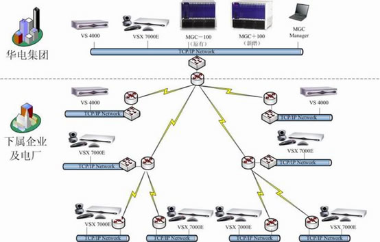 華電集團領(lǐng)導(dǎo)十分重視電力信息化及華電集團電子政務(wù)的建設(shè)工作。為了貫徹國務(wù)院對政府系統(tǒng)信息化建設(shè)的要求,實現(xiàn)華電集團政務(wù)辦公和行業(yè)管理信息服務(wù)的電子化、網(wǎng)絡(luò)化,滿足華電集團建立辦事高效、運轉(zhuǎn)協(xié)調(diào)、行為規(guī)范的行政管理體制的要求,加快推進(jìn)電力行業(yè)信息化建設(shè),華電集團決定開展華電集團信息化建設(shè)二期工程建設(shè),即在現(xiàn)有的基礎(chǔ)上再增加一臺MCU以及在下屬企業(yè)及電廠增加37臺終端。鑒于POLYCOM在視頻會議強大的技術(shù)優(yōu)勢以及神州數(shù)碼在視頻會議系統(tǒng)建設(shè)和實施上的雄厚實力和豐富經(jīng)驗,華電集團決定包括MCU和終端的所有設(shè)備都采用POLYCOM的產(chǎn)品。整個系統(tǒng)主要建立在華電集團現(xiàn)有的視頻會議的基礎(chǔ)之上,依據(jù)H.323標(biāo)準(zhǔn)協(xié)議建設(shè)視頻會議系統(tǒng)二期組網(wǎng)。其中,控制中心新增一臺POLYCOM公司的MGC+100多點控制單元(即MCU);POLYCOM 高性能的VSX7000E作為下屬企業(yè)及電廠主接點視頻會議終端。