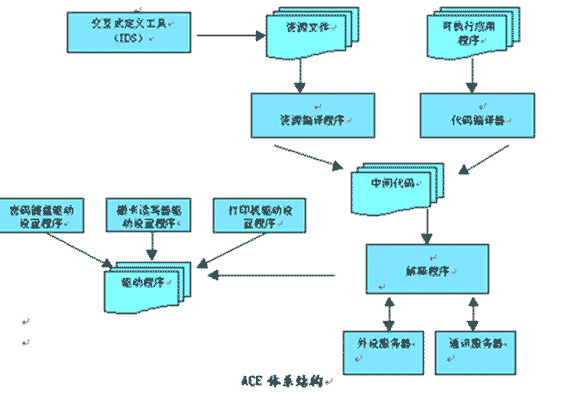 ACE平臺主要由ACE解釋器、編譯器、交互式開發(fā)工具(IDS)、LCG及配置工具等部分組成。