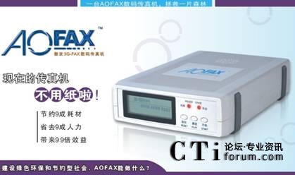 CTI論壇(ctiforum)10月20日消息(記者 潘婷婷):傳真機(jī)自1906年發(fā)明以來(lái),到今天已走過(guò)一百多年的歷史,傳真的形式也從最早的機(jī)械傳真機(jī)、光電傳真機(jī)、數(shù)字傳真機(jī)發(fā)展到今天的電子傳真、電腦傳真、網(wǎng)絡(luò)傳真、無(wú)紙傳真、傳真軟件、傳真系統(tǒng)、傳真服務(wù)器等。其中,由金恒科技(深圳)有限公司推出的傲發(fā)3G-FAX電子傳真系列產(chǎn)品(AOFAX),是新一代傳真的典范,引領(lǐng)著未來(lái)傳真發(fā)展的方向。