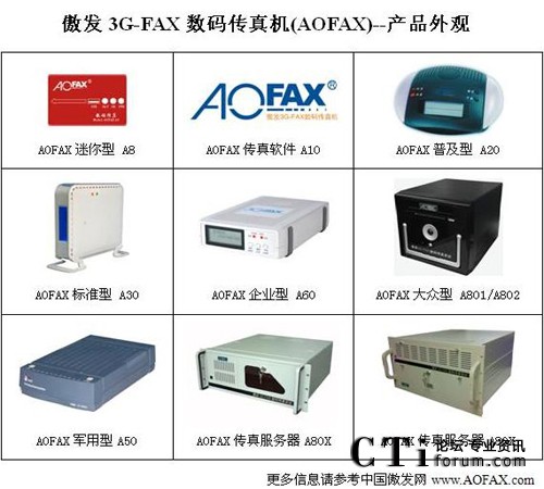 AOFAX系列電腦傳真產(chǎn)品擁有最齊全的型號,包括免費(fèi)使用的AOFAX傳真軟件A10、SOHO/商旅人士便攜使用的AOFAX迷你型數(shù)碼傳真機(jī)A8、單電腦使用的AOFAX普及型數(shù)碼傳真機(jī)A20、4用戶環(huán)境的AOFAX標(biāo)準(zhǔn)型電子傳真機(jī)A30、軍警使用的AOFAX軍用型傳真系統(tǒng)A50、公安專用傳真服務(wù)器A51、營運(yùn)版網(wǎng)絡(luò)傳真服務(wù)期A52、不限用戶數(shù)目的AOFAX企業(yè)型網(wǎng)絡(luò)傳真機(jī)A60、1至2線的AOFAX大眾型傳真服務(wù)器A801和A802,2至256傳真線路多種規(guī)格的AOFAX專業(yè)型傳真服務(wù)器A80X、跨區(qū)域大型公司使用的集團(tuán)傳真系統(tǒng)和行業(yè)解決方案等,價(jià)格從幾百到幾十萬元,可適應(yīng)各類型客戶的需求,以下為AOFAX全系列產(chǎn)品外觀圖。