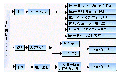 在虛擬聊天室中,電話QQ設(shè)置了81種角色,用戶可以憑自己的興趣愛(ài)好隨意選擇適合自己的角色與他人進(jìn)行聊天。電話QQ不但具有網(wǎng)絡(luò)聊天的優(yōu)點(diǎn),更擁有隨時(shí)、隨地登錄聊天的便利。此外語(yǔ)音聊天的最大優(yōu)勢(shì)在于很好地滿足了人們既要保護(hù)隱私,避免由于交友聊天時(shí)向?qū)Ψ教峁┱鎸?shí)電話/手機(jī)號(hào)碼而引起的麻煩,又能夠隨時(shí)與自己的聊友進(jìn)行溝通,達(dá)到交流的目的。具體流程圖如下(以16868為例):