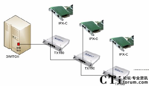 將PBX或網絡Switch的鏡像端口連接到TX100的Network口,另一個Network口和Monitor A就可將一個端口的數(shù)據(jù)備份成兩個端口的數(shù)據(jù),實現(xiàn)了一分二的功能。若再接一個TX100,就可以繼續(xù)分用,以此類推,根據(jù)各個IP應用中實際所需的備份/分用,TX100都可以予以實現(xiàn)。