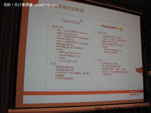 還有一個(gè)客戶是澳大利亞聯(lián)邦銀行(Commonwealth Bank)。該公司選用Oracle Database 11g和Oracle數(shù)據(jù)庫云服務(wù)器,開發(fā)了一個(gè)名為“Oracle即服務(wù)”的PaaS,將300個(gè)中小型數(shù)據(jù)庫環(huán)境整合到3個(gè)網(wǎng)格中。目前該銀行運(yùn)營(yíng)成本減少50%,根據(jù)需要就可從資源池中獲取CPU,實(shí)現(xiàn)了靈活性, 在第1年即實(shí)現(xiàn)盈虧平衡。