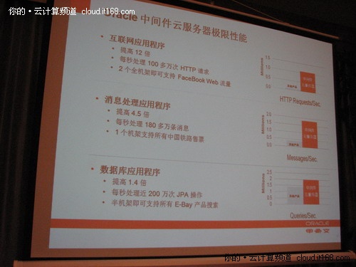 在溝通會(huì)上,喻思成用數(shù)字來告訴媒體Oracle中間件云服務(wù)器的Java應(yīng)用性能和可靠性在甲骨文進(jìn)行的內(nèi)部測(cè)試中,單機(jī)架Oracle Exalogic Elastic Cloud顯示: 互聯(lián)網(wǎng)應(yīng)用性能提高12倍,達(dá)到每秒100萬HTTP以上;消息處理應(yīng)用性能提高4.5倍,每秒能處理超過180萬條消息。