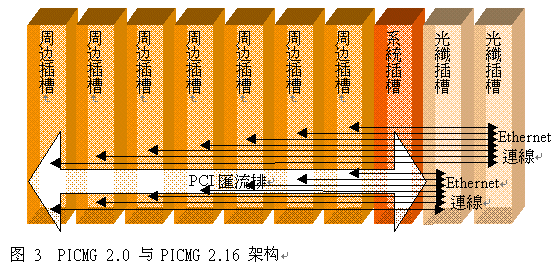 在2001年9月,PICMG協(xié)會(huì)核準(zhǔn)PICMG 2.16 封包交換背板(Packet Switched Backplane)規(guī)格,本規(guī)格對于在一個(gè)CompactPCI架構(gòu)里外圍插槽(peripheral slots)與光纖插槽(fabric slots)之間10/100/1000Mbit Ethernet的互聯(lián)做了詳細(xì)定義。光纖插槽是相互備援的,PICMG2.16兼容系統(tǒng)已被廣泛應(yīng)用于多種用途上,Ethernet互聯(lián)與IP數(shù)據(jù)傳輸需求的普遍特性促使系統(tǒng)提供者廣泛采用此規(guī)格。圖3顯示典型的PICMG2.0與2.16架構(gòu)。