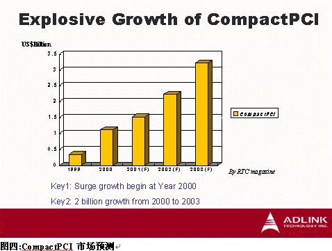 Magazine 估計,CompactPCI市場將由1999年的美金$350 Million成長到2003年的美金$3200 Million,年復合成長率高達45.6%,其中又以2002年至2003年最大幅成長。CompactPCI為工業(yè)計算機產業(yè)開拓了一個以往傳統(tǒng)工業(yè)計算機無法應用的新市場,而CompactPCI需針對電信等級應用提供高可靠度及達到嚴苛高品質要求,卻又為傳統(tǒng)工業(yè)計算機廠商豎立高進入障礙,因此,目前能提供電信級CompactPCI寬頻通訊平臺幾為國外廠商,如Motorola、Ziatech、Force
