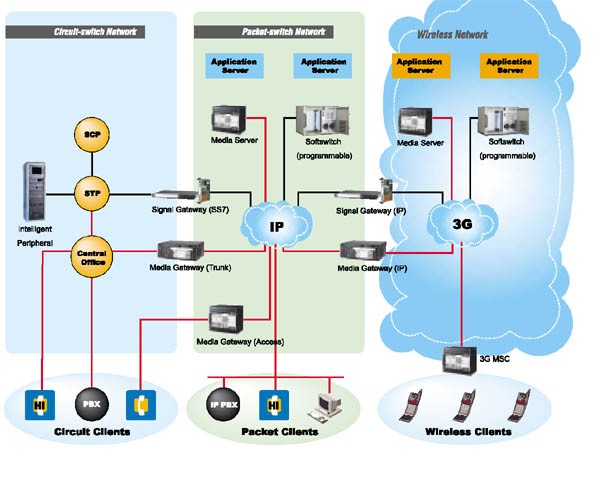 在下一帶網(wǎng)絡(luò)(NGN)中媒體網(wǎng)關(guān)在軟交換(softswitch)的控制下,將一種網(wǎng)絡(luò)中的媒體轉(zhuǎn)換成另一種網(wǎng)絡(luò)所要求的媒體格式。如媒體網(wǎng)關(guān)能夠在電路交換網(wǎng)的承載通道和分組網(wǎng)的媒體流之間進行轉(zhuǎn)換,可以處理音頻、視頻或T.120,也具備處理這三者任意組合的能力,并且能夠進行全雙工的媒體翻譯,可以演示視頻/音頻消息,實現(xiàn)其他IVR功能,同時還可以進行媒體會議等。