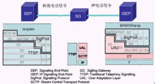 圖中粉紅色部分為SIGTRAN的協(xié)議棧,在它們之上的是對應(yīng)的電話信令協(xié)議。SIGTRAN的協(xié)議棧分為2層:一層是SCTP,它提供多個(gè)流的,可靠的數(shù)據(jù)傳輸,用戶數(shù)據(jù)的捆綁和分段,阻塞和流量控制,防止"拒絕服務(wù)"和"偽裝"的攻擊等功能。另一層是用戶適配層,圖中由SUA、M3UA、M2UA、M2PA、IUA和V5UA五個(gè)適配模塊所組成,它們分別來滿足各種電話信令協(xié)議適配的要求。