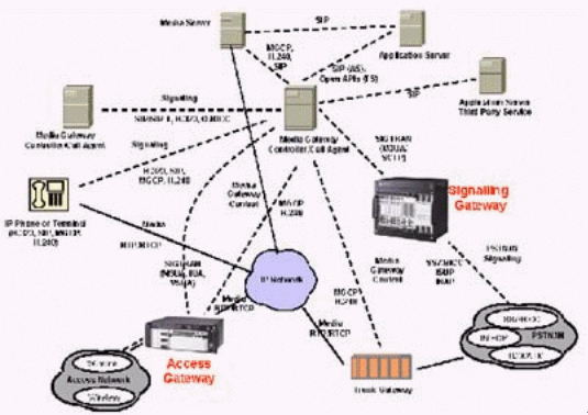 本例中的媒體網(wǎng)關(guān)控制器(MGC)終結(jié)所有的信令,包括直接傳輸?shù)暮屯ㄟ^IP的信令,完成如一個(gè)SIP電話向PSTN網(wǎng)絡(luò)發(fā)送信號之類的信令互通,還對打到VoIP網(wǎng)絡(luò)的呼叫進(jìn)行鑒權(quán)和選擇路由,并提供計(jì)費(fèi)信息。這個(gè)MGC還通過SIP/SIP-T,H.323或Q.BICC與其他的MGC通信。