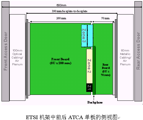 PICMG 3.0機(jī)構(gòu)要求主要來自于對(duì)600mm ETSI 和19" EIA標(biāo)準(zhǔn)機(jī)柜空間使用的研究。PICMG 3.0委員會(huì)在考慮單板尺寸能支持下一代元器件對(duì)物理和散熱的需求的同時(shí),機(jī)箱空間能和板子能達(dá)到最大限度的配合和利用。最初的工作是基于歐規(guī)卡的標(biāo)準(zhǔn),繼而又提升到支持低成本的片狀金屬架構(gòu)(簡(jiǎn)單電訊封裝)。對(duì)后走線模塊的支持滿足了對(duì)后I/O應(yīng)用的需求。在決定可以使用的單板空間時(shí),也充分考慮了前、后板的進(jìn)深范圍以供大量電纜束綁空間。經(jīng)過對(duì)不同規(guī)格尺寸的單板的優(yōu)點(diǎn)進(jìn)行討論之后,PICMG 3.0組織統(tǒng)一規(guī)格如下:前板 8U x 280mm,進(jìn)深1.2" pitch,選配后板8U x 70mm深。基于1.2" pitch,19" EIA機(jī)框可以支持14槽,而600mm ETSI的機(jī)框可以支持16槽。下圖所示為600mm ETSI機(jī)架中的ACTA前后單板的側(cè)視圖: