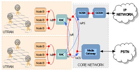 UTRAN為用戶端的移動電話、其它無線設(shè)備(如PDA, 便攜計算機(jī)等)提供到有線網(wǎng)絡(luò)的連接,它包括B節(jié)點(Node