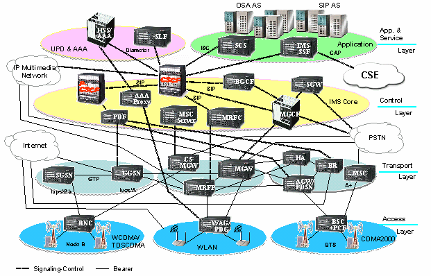 控制層是由以IMS為核心的所有控制部分所組成。IMS獨(dú)立于接入技術(shù),是3G"家族"公用的。IMS基于IP技術(shù),支持語(yǔ)音、視頻、文字、數(shù)據(jù)等業(yè)務(wù)以及這些業(yè)務(wù)的組合,支持IPv6和QoS,支持開放的業(yè)務(wù)接口。該層還包括如MSC服務(wù)器,信令網(wǎng)關(guān)等設(shè)備。