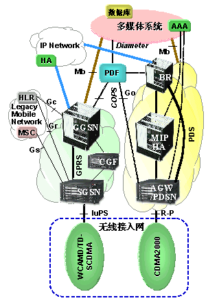 PDS采用MIP技術(shù),是支持多媒體的和傳統(tǒng)的移動(dòng)數(shù)據(jù)業(yè)務(wù)的網(wǎng)絡(luò)。AGW包括PDSN以及其他一些所需要的功能,提供了對(duì)各種接入網(wǎng)絡(luò)的公共接口。它提供移動(dòng)IP登記和鑒權(quán),支持外部代理(FA)和分組數(shù)據(jù)傳輸,切換、AAA客戶端、QoS管理和策略執(zhí)行等功能。歸屬代理(HA)主要完成用戶當(dāng)前附著點(diǎn)的登記和用戶IP包的前轉(zhuǎn)兩大功能。