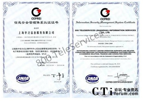 CTI論壇(ctiforum)1月31日消息(記者 浩宇):2012年1月,著名的服務(wù)外包呼叫中心和電子商務(wù)運營中心企業(yè)--飛翱集團旗下全資子公司上海華泛信息服務(wù)有限公司---,繼2009年獲得ISO9001 質(zhì)量管理體系國際認證后。經(jīng)過半年嚴格的綜合考評,再次成功獲得又一由國際上公認的ISO/IEC 27001:2005(也簡稱為:ISO27001)并獲得具有美國認證機構(gòu)國家認可委員會ANAB授予的雙重信息安全管理體系認證。