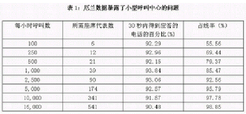 這張厄蘭表生動地說明了當(dāng)呼叫中心規(guī)模增長是其效率的迅速增長。這張表對應(yīng)的情況是這樣的:處理每一個呼叫的平均時間是2分鐘。要實現(xiàn)的目標是90%的呼叫要在30秒內(nèi)得到應(yīng)答。第一列顯示了呼叫量的增長,第二列顯示了相對于特定的呼叫量,為達到指定的服務(wù)水平,在該厄蘭模型下所需的最少座席代表數(shù)。