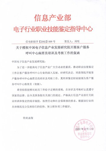 中國(guó)電子信息產(chǎn)業(yè)發(fā)展研究院職業(yè)技能培訓(xùn)部是中國(guó)電子信息產(chǎn)業(yè)發(fā)展研究院旗下專(zhuān)業(yè)從事IT職業(yè)技能培訓(xùn)的機(jī)構(gòu)。呼叫中心職業(yè)技能培訓(xùn)工作是培訓(xùn)中心常年開(kāi)展的主要培訓(xùn)項(xiàng)目。培訓(xùn)中心受信息產(chǎn)業(yè)部委托,負(fù)責(zé)全國(guó)范圍內(nèi)"呼叫中心客戶(hù)服務(wù)座席員"的授權(quán)培訓(xùn)及考核工作。既是呼叫中心行業(yè)基礎(chǔ)操作人員培訓(xùn)及考核的權(quán)威機(jī)構(gòu),又是配合行業(yè)管理、全面支撐和提升整個(gè)呼叫中心產(chǎn)業(yè)的服務(wù)機(jī)構(gòu)。