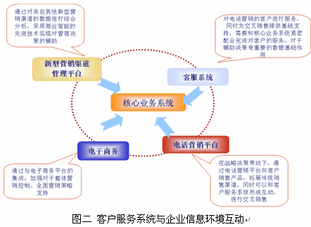 客戶服務(wù)系統(tǒng)不是孤立的系統(tǒng),是能夠與客戶現(xiàn)有信息環(huán)境,包括:核心業(yè)務(wù)系統(tǒng)、多渠道營銷、電子商務(wù)等進行互動的智能信息系統(tǒng),從而使呼叫中心成為企業(yè)的戰(zhàn)略資產(chǎn),幫助企業(yè)提升客戶滿意度、深度挖掘客戶價值。客戶服務(wù)系統(tǒng)與企業(yè)其它信息系統(tǒng)的互動可以通過圖二反映。