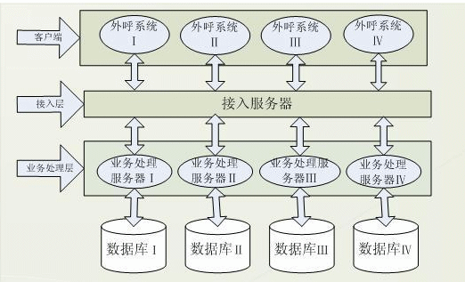 針對(duì)舊外呼業(yè)務(wù)系統(tǒng)的弊端及業(yè)務(wù)系統(tǒng)特點(diǎn),賽迪呼叫研發(fā)了基于三層C/S結(jié)構(gòu)的外呼業(yè)務(wù)系統(tǒng),該系統(tǒng)分客戶端,接入服務(wù)器,業(yè)務(wù)服務(wù)器及數(shù)據(jù)庫(kù)端?蛻舳税l(fā)送請(qǐng)求給分配服務(wù)器,接受到請(qǐng)求后,分配服務(wù)器根據(jù)客戶端的請(qǐng)求數(shù)據(jù)將其分配給自身的業(yè)務(wù)服務(wù)器做業(yè)務(wù)處理,這樣客戶端與業(yè)務(wù)服務(wù)器建立起聯(lián)系,結(jié)構(gòu)體系如圖: