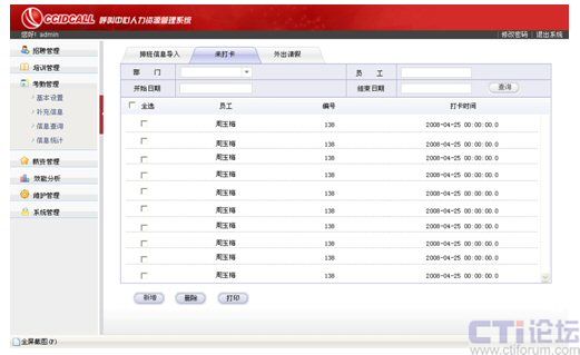 利用統(tǒng)計(jì)部分的四項(xiàng)內(nèi)容實(shí)現(xiàn)對(duì)座席從招聘前、招聘中和招聘后的全面管理,通過(guò)培訓(xùn)使座席擁有工作必備的知識(shí)、技能和能力,培養(yǎng)他們對(duì)企業(yè)的認(rèn)同感、歸屬感,同時(shí),利用詳盡的考勤管理最大限度、公平合理地滿足座席內(nèi)在報(bào)酬和外在報(bào)酬上的期望和需要。