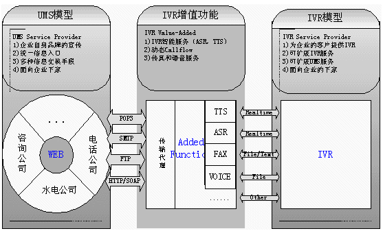 。ǘ㊣VR系統(tǒng)的傳統(tǒng)缺點是缺乏智能化,流程更改困難,播放的語音或者內(nèi)容必須預(yù)先錄制.所以我們提供UMS服務(wù),增強(qiáng)IVR的功能. 使我們的IVR功能增強(qiáng)(Ext-IVR Service Provider)