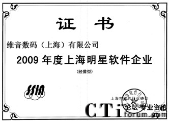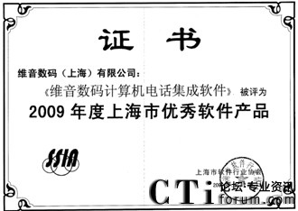 CTI論壇(ctiforum)10月19日消息: 金秋十月,捷報頻傳,由上海市軟件行業(yè)協(xié)會開展的2009年度上海明星軟件企業(yè)評選結果出爐,維音數碼不僅榮登:“2009年度上海明星軟件企業(yè)(經營型)”和“2009年度上海明星軟件企業(yè)(創(chuàng)新型)”獲獎榜單,維音數碼自主研發(fā)的軟件產品VisionCTI(計算機電話集成系統(tǒng))更是被評定為“2009年度上海市優(yōu)秀軟件產品獎”。