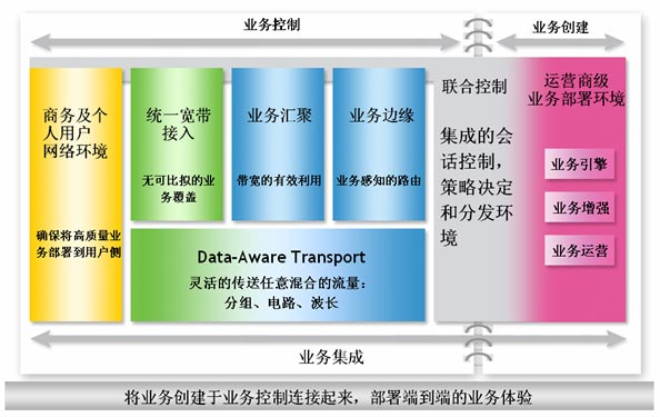 首先,我們提供了智能的、具備業(yè)務(wù)感知能力的、安全的融合網(wǎng)絡(luò):這意味著通過安全的網(wǎng)絡(luò)將正確的業(yè)務(wù)部署到正確的客戶端,并保證最高體驗(yàn)質(zhì)量。它的本質(zhì)是在網(wǎng)絡(luò)的各個(gè)層面部署智能化和業(yè)務(wù)感知的元素,并實(shí)施完整的安全機(jī)制,正如我們前面提到的,業(yè)務(wù)演進(jìn)與網(wǎng)絡(luò)間相互有著緊密關(guān)聯(lián),為達(dá)到業(yè)務(wù)需求,網(wǎng)絡(luò)需要能夠根據(jù)業(yè)務(wù)進(jìn)行靈活調(diào)整。