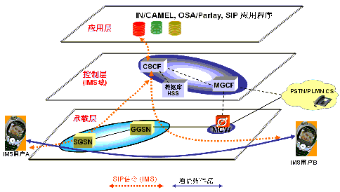 VPN等。圖中以移動(dòng)分組網(wǎng)的承載方式為例,描述了IMS用戶通過手機(jī)進(jìn)行IMS會話的方式,主要的承載層設(shè)備有SGSN、GGSN,以及媒體網(wǎng)關(guān)MGW。SGSN和GGSN可以完全重用現(xiàn)網(wǎng)設(shè)備,不需要硬件升級,僅通過做相關(guān)配置就可以支持IMS了。MGW是負(fù)責(zé)媒體流在IMS域和CS域互通的功能實(shí)體,主要解決話音互通問題。無論具體采用哪一種接入方式,只要基于IP技術(shù),所有的IMS用戶信令就可以很好地傳送到控制層。