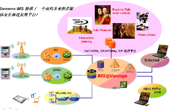 西門子IP多媒體子系統(tǒng)名為IMS@vantage,它完全遵循3GPP規(guī)范,提供了一個(gè)支持語音/多媒體數(shù)據(jù)業(yè)務(wù)集成的開放式網(wǎng)絡(luò)控制平臺,能為運(yùn)營商以最經(jīng)濟(jì)快捷的方式提供多媒體應(yīng)用及開發(fā)環(huán)境。