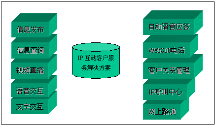 經(jīng)過對比分析,我們發(fā)現(xiàn),目前國際國內(nèi)市場上很多客戶服務產(chǎn)品,大都僅僅完成客戶服務的一部分。北極星“IP互動客戶服務中心解決方案”則引入互動客戶服務(ICS:Interactive Customer Service)系統(tǒng)以及數(shù)碼互動直播的概念,形成了由視頻點播、網(wǎng)上路演、語音和文字交互、IP客戶服務中心、Web800語音電話、實時服務中心、專家實時在線、客戶關(guān)系管理、在線尋呼系統(tǒng)和客戶社區(qū)服務系統(tǒng)等全方位的服務內(nèi)容。該方案主要基于IP架構(gòu),系統(tǒng)擴展性非常靈活,系統(tǒng)體現(xiàn)的客戶服務思想非常能夠滿足我們的需求。2001年3月,經(jīng)過一段時間的試運行后,我們正式推出了這套“IP互動客戶服務”系統(tǒng)。