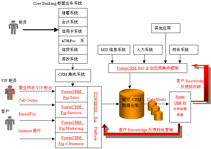 利用PowerCRM的銀行分析型CRM解決方案,對客戶信息進(jìn)行全面的分析,從而挖掘出許多客戶知識,繼而制定和改進(jìn)相應(yīng)的市場策略,應(yīng)用于PowerCRM運營型CRM系統(tǒng)中,更好地指導(dǎo)營銷人員為客戶服務(wù)和完善客戶服務(wù)流程;同時也需要反饋到銀行內(nèi)部系統(tǒng),用于增強銀行內(nèi)部的運營效率。