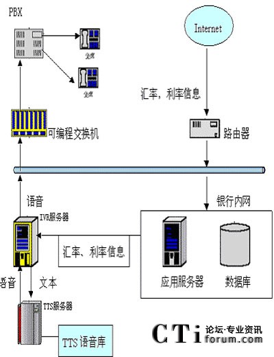 銀行可從網(wǎng)上下載匯率信息或利率信息,之后將這些信息的文本傳遞給IVR服務器,IVR會通過調用TTS服務器得到這些信息的語音流,之后就可以在坐席上播放這些匯率或利率的語音了。