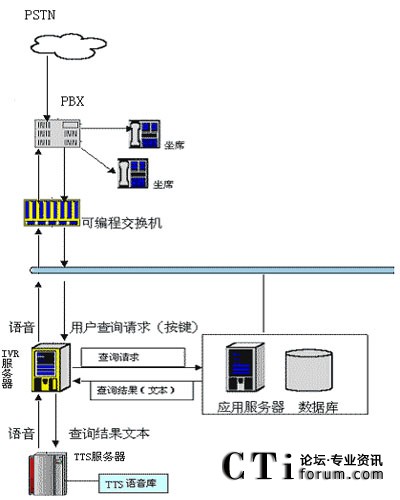 用戶可以通過電話提交他的查詢請求(比如使用按鍵方式,提交個人卡號等),IVR服務器收到請求后會向其他應用服務器提交此查詢請求,當IVR得到查詢結果后,他會將文本形式的查詢結果交給jTTS服務器,jTTS服務器會返回查詢結果的語音形式,最終語音會在坐席上播放,用戶就可以聽到他剛才所要查詢的信息。
