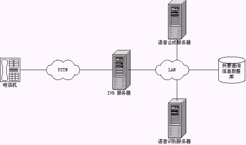 這種模式是最常見的一種接入情況。將原有煩瑣的按鍵式提示改成更具人性化的交談式語音交互,類似于語音門戶模式。這是目前大家普遍認(rèn)同的一種語音識別技術(shù)應(yīng)用方式。相比原有的按鍵方式,系統(tǒng)的新穎程度、個性化程度、用戶操作的方便程度等都得到了極大的提高,如語音識別技術(shù)在股票查詢中的成功應(yīng)用,在點歌系統(tǒng)中的成功應(yīng)用等;另外利用語音識別技術(shù)也解決了一些原有系統(tǒng)無法實現(xiàn)的技術(shù)難題,如火車時刻查詢、機(jī)場航班查詢等,原有系統(tǒng)借助郵政編碼、電話區(qū)號等的方式讓人無所適從,現(xiàn)在直接和系統(tǒng)交談,順利獲取所需信息,可以說是語音識別技術(shù)一個成功的應(yīng)用。這種系統(tǒng)的拓?fù)浣Y(jié)構(gòu)如下圖示:
