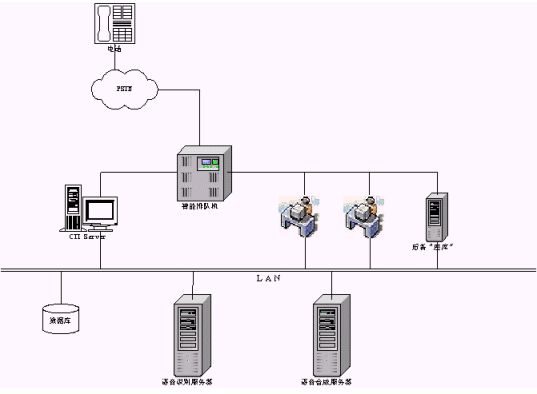 IVR模式是最常見的一種模式,這種模式也可以結(jié)合應(yīng)用到前端以交換機(jī)接入的系統(tǒng)中去,在系統(tǒng)的IVR服務(wù)流程上,做出相應(yīng)的修改,加入語音識別技術(shù),同樣可以得到成功應(yīng)用。另外一種模式暫且稱它為后備模式,該模式一個主要的特點是放在后端,比如在有座席接聽的情況下,采用語音識別技術(shù)的系統(tǒng)不被激活,也就是系統(tǒng)不給派線。當(dāng)系統(tǒng)繁忙,而座席都占用的情況下,系統(tǒng)派線到采用語音識別技術(shù)的系統(tǒng),如同一個備用的座席。在這樣一個"座席"的軟件設(shè)計上,如同與人的交談一樣,系統(tǒng)也提出正常的詢問,但必須強(qiáng)調(diào)引導(dǎo)用戶來按照事先設(shè)定好的流程進(jìn)行。這樣可以保證系統(tǒng)的接通率,特別是在一些對接通率和服務(wù)及時性要求比較高的場合采用,典型的代表如電信114查號臺和移動的1860客服中心,這些系統(tǒng)往往是隨著用戶急劇增加,撥打量也在穩(wěn)步上升,而呼叫響應(yīng)要求及時。系統(tǒng)拓?fù)浣Y(jié)構(gòu)如下圖示。