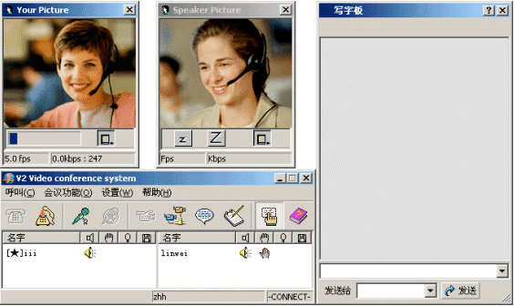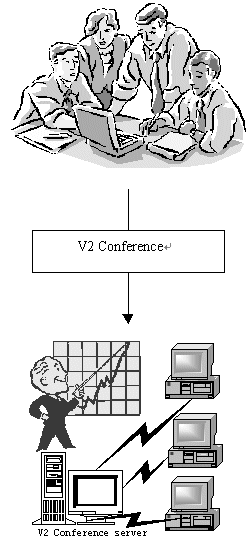 I P視頻會議,是一種利用普通的PC機加上簡單的視頻攝像頭和耳機麥克風(fēng),通過Internet或者是局域網(wǎng)進行傳輸,以低廉的成本傳送數(shù)據(jù)、視頻和音頻信號的新型會議方式。V2公司的視頻會議產(chǎn)品V2 Conference 就采用了這種技術(shù)先進而且經(jīng)濟合算的方式,與傳統(tǒng)的需要專用的服務(wù)器和硬件支持的視頻會議相比,該系統(tǒng)可以使您無需進行成本高昂的投入,就實現(xiàn)高質(zhì)量、高可靠性的音視頻通訊。同時,為了方便您的管理,V2 Conference提供了會議管理的功能,使您足不出戶,就可以掌控全局。