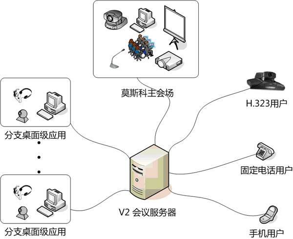 俄羅斯百事可樂公司莫斯科總部和俄羅斯其它各地分支機構(gòu)通過公眾互聯(lián)網(wǎng)連接,以V2視頻會議系統(tǒng)為紐帶,將不同的參會用戶連接在一起,實現(xiàn)即時的音視頻溝通及數(shù)據(jù)協(xié)作。不僅是普通的PC機用戶,包括傳統(tǒng)H.323用戶,手機和固定電話用戶等都可以加入V2視頻會議。