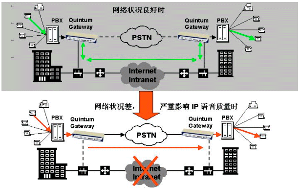 。。Quintum TASQTM專利技術可動態(tài)監(jiān)控網絡流量狀況,在任何時刻當網絡頻寬低于企業(yè)預設門限值,以致于無法負荷企業(yè)所要求的語音品質時,語音回路將自動切換到傳統(tǒng)