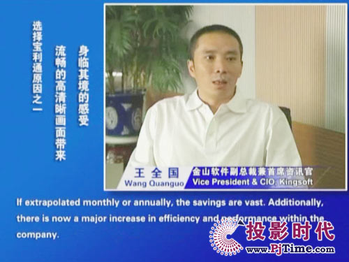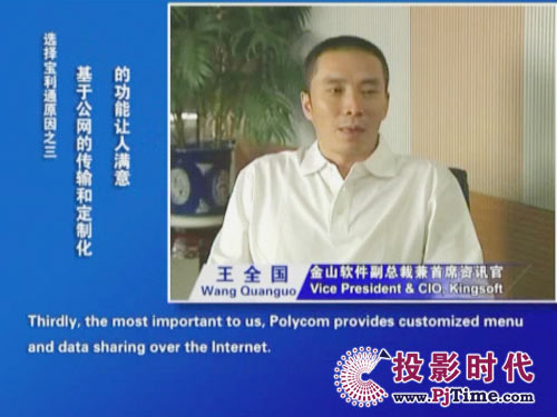 金山軟件副總裁兼首席資訊官王全國(guó)先生說(shuō)道:“對(duì)于軟件行業(yè)來(lái)說(shuō),及時(shí)、高效的溝通是保持競(jìng)爭(zhēng)優(yōu)勢(shì)的重要前提。相比之前使用的標(biāo)清產(chǎn)品,寶利通高清視頻會(huì)議系統(tǒng),提供了完全不同的體驗(yàn),流暢的高清晰畫(huà)面猶如真實(shí)的面對(duì)面溝通。而且我們公司并沒(méi)有申請(qǐng)專線,所有的應(yīng)用都是基于公網(wǎng)實(shí)現(xiàn)的。另一方面,新型全中文定制菜單的運(yùn)用,令我們使用起來(lái)非常方便,這更提高了我們使用視頻通信手段實(shí)現(xiàn)異地溝通的熱情!