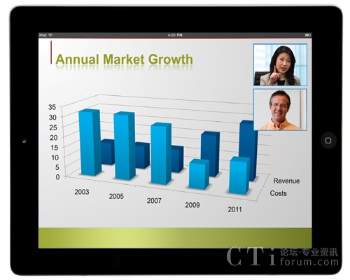 現(xiàn)在,在視頻通信需求增長(zhǎng)、勞動(dòng)力越來(lái)越偏遠(yuǎn)以及技術(shù)進(jìn)步的推動(dòng)下,移動(dòng)視頻會(huì)議正在顯著增長(zhǎng)。今天的企業(yè)往往在地域上越來(lái)越分散,越來(lái)越虛擬,全球遠(yuǎn)程辦公人員已超過(guò)10億。同時(shí),技術(shù)的進(jìn)步也推動(dòng)了視頻移動(dòng)社會(huì),包括配有攝像頭的移動(dòng)平板電腦和智能手機(jī)的普及;3G、4G和Wi-Fi網(wǎng)絡(luò)的出現(xiàn);以及云服務(wù)。事實(shí)上,Gartner仍然看好多媒體平板電腦市場(chǎng)帶來(lái)的機(jī)會(huì),據(jù)他們預(yù)測(cè)到2015年平板電腦將售出3.2億部,到年底,累計(jì)銷售將超過(guò)9億部。到2015年,采用視頻聊天的人數(shù)預(yù)計(jì)將增長(zhǎng)14倍,超過(guò)1.4億人。