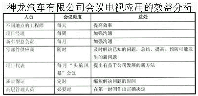 下表通過對神龍汽車有限公司應(yīng)用會議電視系統(tǒng)的分析,展示了會議電視虛擬應(yīng)用所帶來的益處。