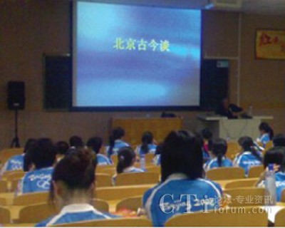 7月25日中央財經(jīng)大學的課堂里,近百位奧運觀眾呼叫中心的志愿者聆聽了北京第二外國語大學西班牙語呂龍根教授的講座——“北京古今談”。呂教授幽默的語言、澎湃的激情,感染并征服了在座的每一位志愿者。教授從中國古代的六大古都(北京、西安、洛陽、開封、南京、杭州)談到古代北京的五朝建都(遼、金、元、明、清),從北京偉大的中軸線,談到北京建筑的風水學,從北京的胡同和四合院,談到北京的著名小吃,等等等等?芍^是古今暢想、無所不談,真正讓我們領略了何為學者風范。