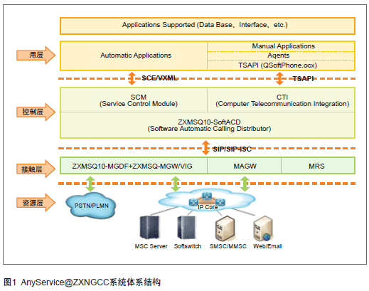 中興通訊AnyService@ZXNGCC多媒體統(tǒng)一接觸中心系統(tǒng)以中興通訊ZXMSQ10多媒體軟排隊(duì)機(jī)系統(tǒng)為基礎(chǔ),基于軟交換技術(shù)。ZXMSQ10由接入網(wǎng)關(guān)和軟排隊(duì)機(jī)兩個(gè)核心部件組成,語(yǔ)音、視頻呼叫(呼入和呼出)通過ZXMSQ10多媒體軟排隊(duì)機(jī)匯聚到AnyService@ZXNGCC系統(tǒng),其他媒體通過MAGW接入到NGCC系統(tǒng),同時(shí)AnyService@ZXNGCC也選擇最佳的媒體類型將信息主動(dòng)反饋給用戶,形成雙向溝通的渠道,實(shí)現(xiàn)呼叫中心系統(tǒng)的被動(dòng)服務(wù)和主動(dòng)服務(wù)。