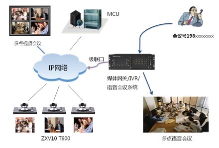 在現(xiàn)有視頻會議網(wǎng)絡(luò)基礎(chǔ)上新增語音網(wǎng)關(guān)設(shè)備,主要負(fù)責(zé)PSTN、移動網(wǎng)和IP網(wǎng)絡(luò)的信令轉(zhuǎn)接、音頻編碼的轉(zhuǎn)換、多點純語音會議、IVR會議引導(dǎo)。